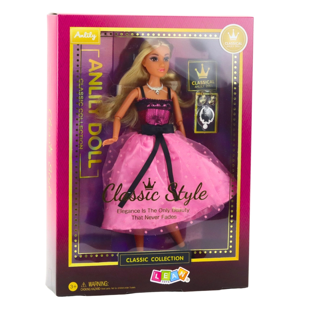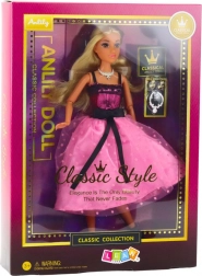 Elegante pop ANLILY in een roze‑zwarte baljurk die elke kleine modeliefhebber zal verrassen. Ze heeft lang blond haar om kapsels te maken, bewegende ledematen voor realistisch spel en veel accessoires – kettingen, oorbellen en zwarte schoenen. Ideaal voor creatief spelen en stijlvolle verhalen.