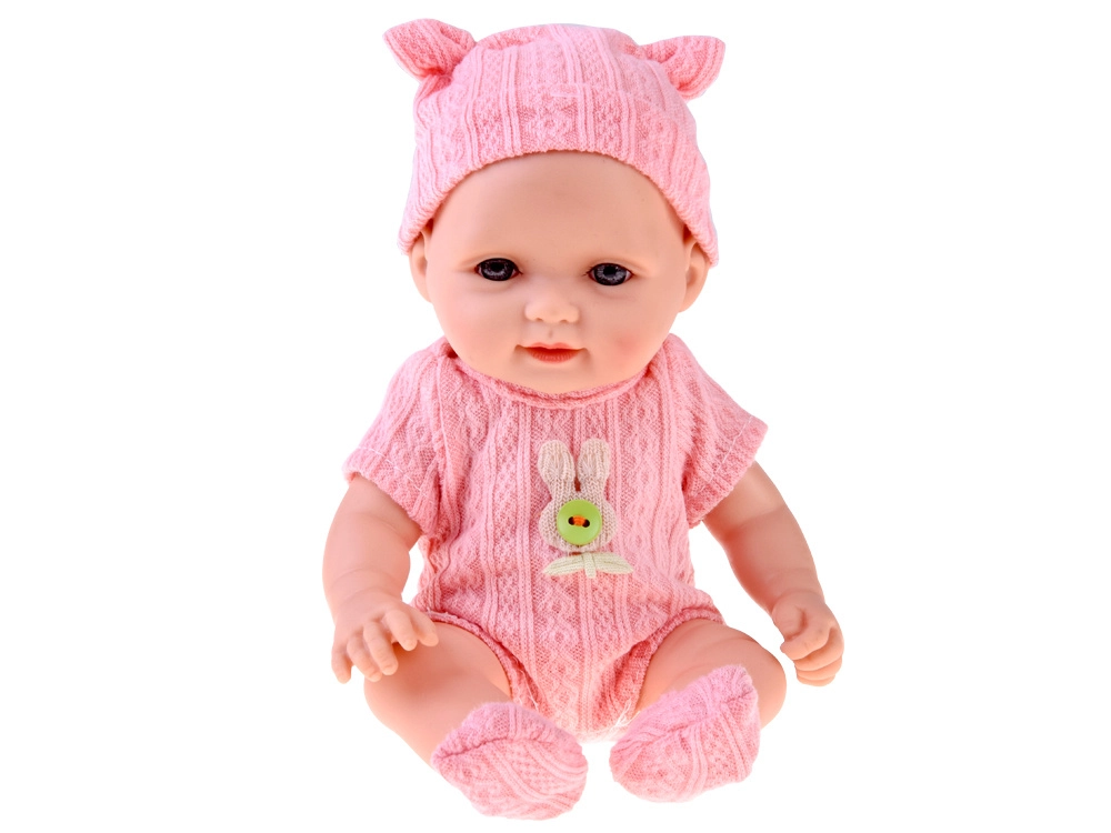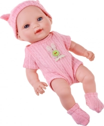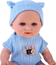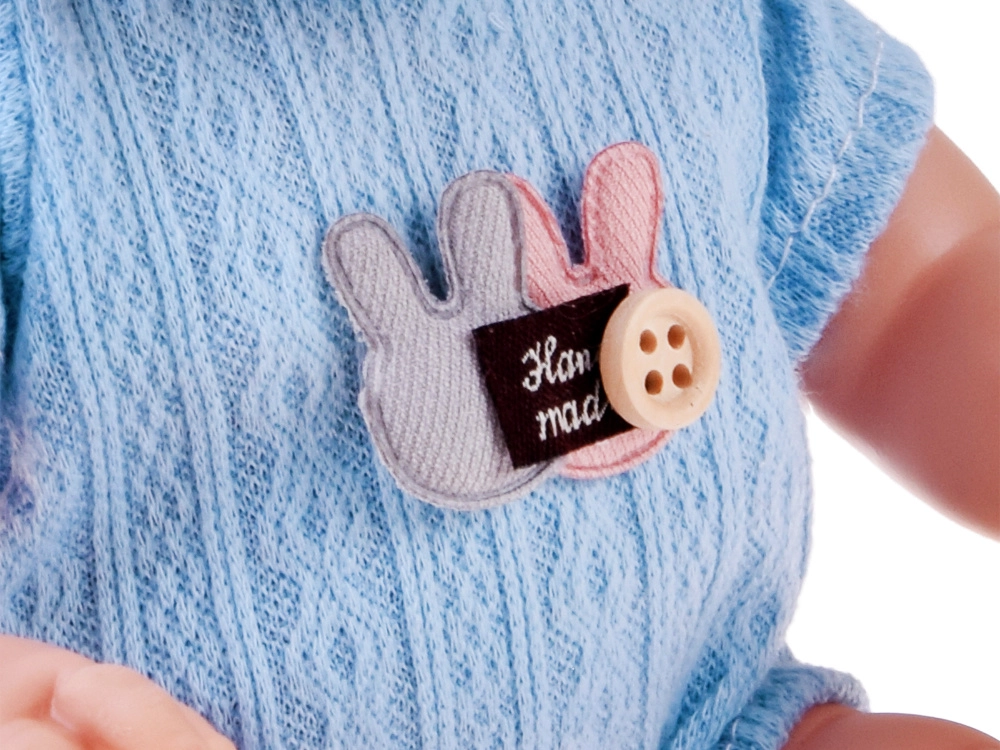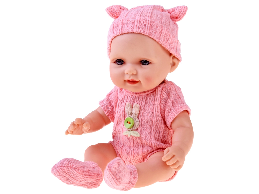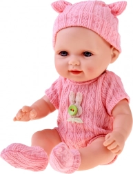 De pop heeft beweeglijke ledematen en een hoofdje, zodat je haar kunt laten zitten of neerleggen om te slapen. De outfit bestaat uit zachte, gebreide boxpakjes met klittenband die eenvoudig aan en uit te trekken zijn – samen met het mutsje en de schoentjes stimuleren ze de fijne motoriek en de zelfstandigheid van het kind. De kleertjes zijn verkrijgbaar in twee kleurvarianten: roze en lichtblauw.