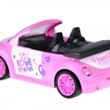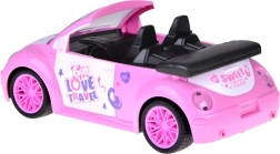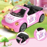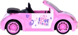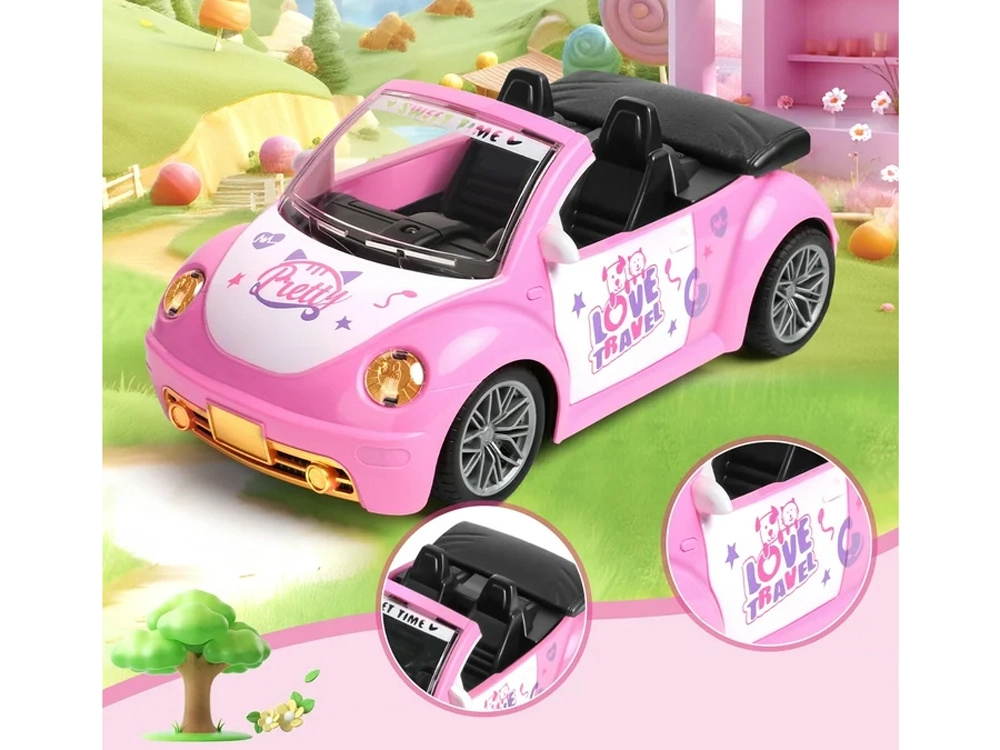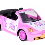 De open cabrio met gedetailleerd interieur en decoratieve stickers past perfect in de wereld van poppen en figuurtjes.