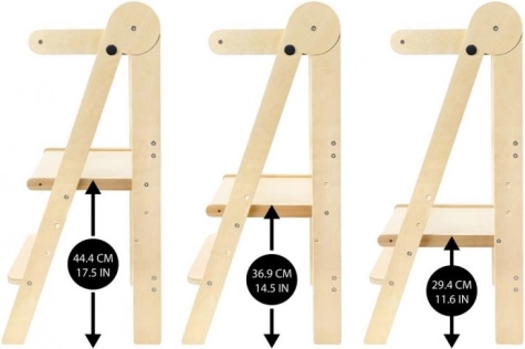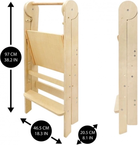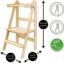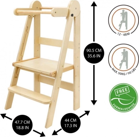 Het doordachte ontwerp maakt het voor kinderen veilig en zelfstandig om omhoog te klimmen dankzij de trede op 16 cm hoogte. De toren is inklapbaar, gemakkelijk te verplaatsen van de keuken naar de badkamer en neemt bij opslag minimaal ruimte in. Het geteste hout bevat geen formaldehyde, zodat je zeker bent van een gezond materiaal.