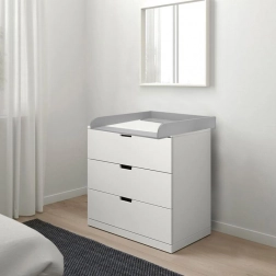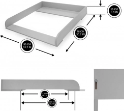 Praktische houten aankleedopzet in een elegante grijze kleur voor veilig en comfortabel verschonen. Biedt eenvoudige montage en demontage, een schuifbare voorste plank tot 4 cm en compatibiliteit met IKEA‑commodes (Nordli, Malm, Hemnes). De ideale oplossing voor ruimtebesparing en doordachte organisatie in de kinderkamer.