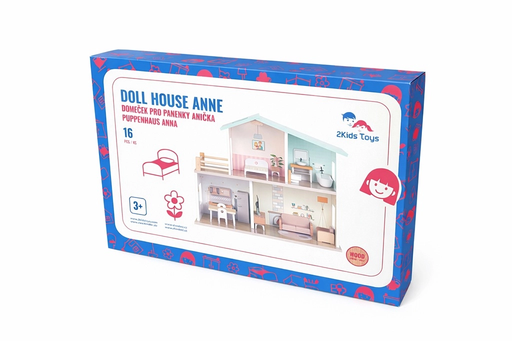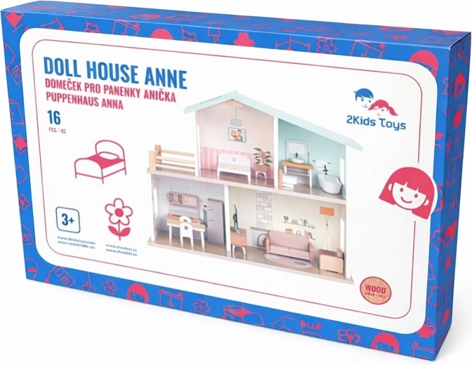 Ontdek het prachtige houten poppenhuis Anička van 2Kids Toys met twee verdiepingen, een balkon en volledig ingerichte kamers. Dankzij 16 meubelstukken en accessoires genieten kinderen van urenlang creatief rollenspel, waarbij fantasie en sociale vaardigheden worden ontwikkeld. Hoogwaardige houten afwerking, zachte kleuren en een stabiele constructie maken het een charmante aanvulling op de kinderkamer. Inclusief montagehandleiding; het poppenhuis wordt geleverd als bouwpakket. Geschikt vanaf 3 jaar.