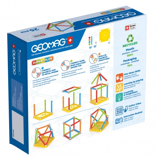De GEOMAG Supercolor bouwset stimuleert de fantasie, logica en fijne motoriek van kinderen. Dankzij de magnetische verbindingen kunnen kinderen eenvoudig verschillende vormen, torens en basis geometrische constructies maken. Heldere kleuren en stevige stalen bolletjes zorgen voor eenvoudig koppelen en stabiliteit.