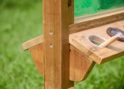 De robuuste houten constructie met stabiele A‑poten is weerbestendig en ontworpen voor intensief gebruik in kleuterscholen, naschoolse opvang en thuistuinen. De geïntegreerde plank met gefreesde openingen biedt veilig plaats aan 20 bekers, waterbakjes en kwasten – alles overzichtelijk bij de hand en zonder omvallen.
