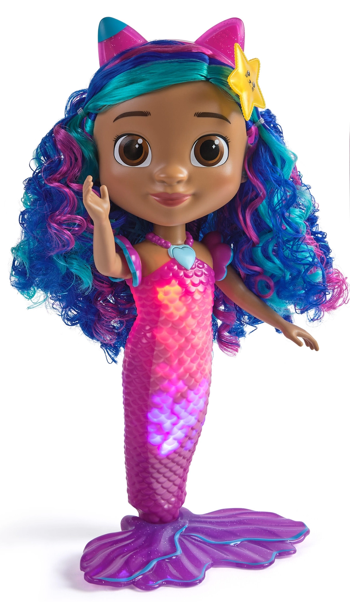 Zeemeermin Gabby betovert kinderen met opvallende kleuren, speels design en interactieve functies. Door op de hartvormige ketting te drukken, gaan de lichtjes aan en hoor je tot 14 geluidseffecten, zinnen en melodieën geïnspireerd op het geliefde verhaal. De kleurrijke staart licht op en zorgt bij elk spel voor een schitterend schouwspel.
