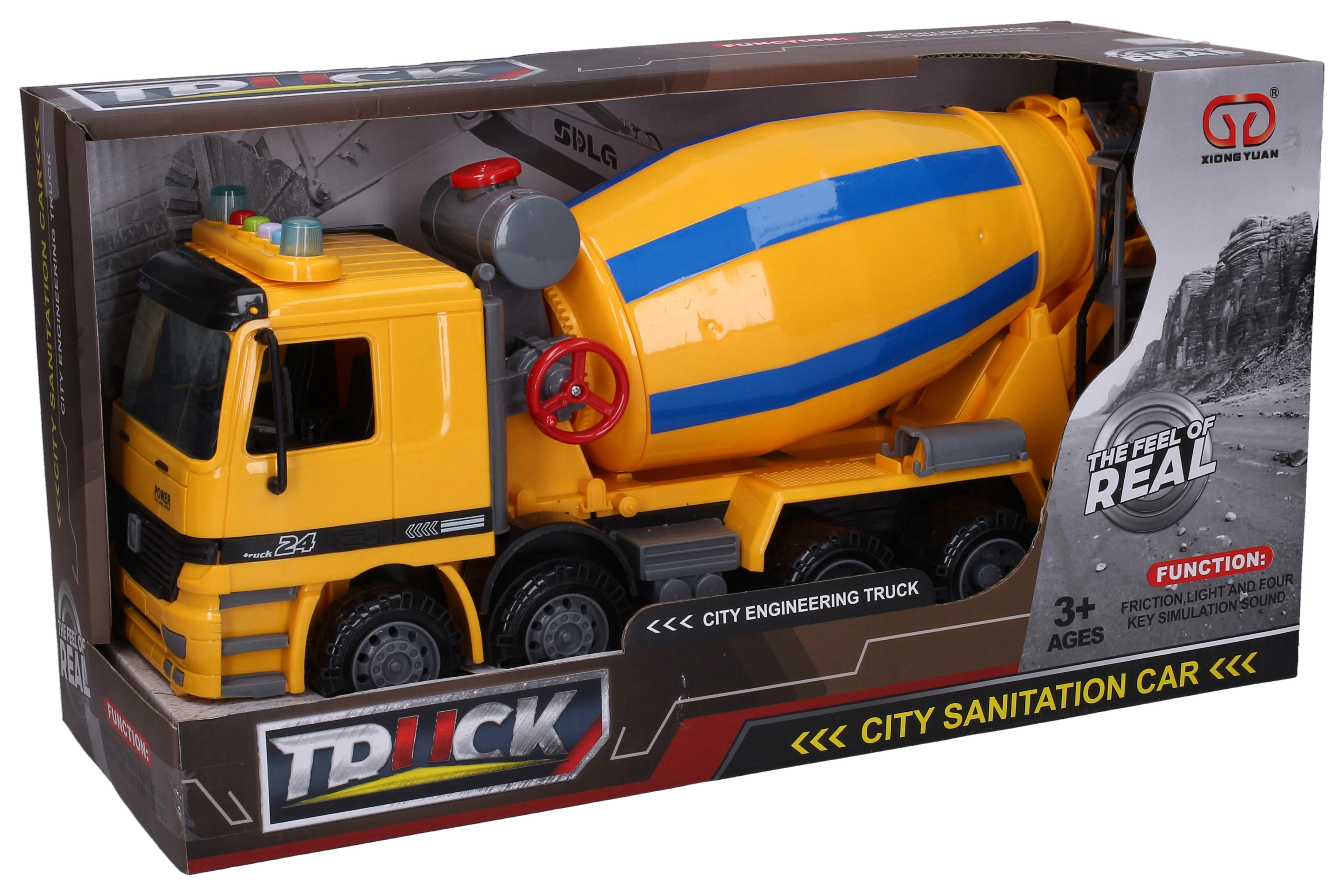 Een realistische betonmolenwagen van 40 cm die kleine bouwers zal verblijden. Voorzien van een zwaaivliegwiel voor soepele ritten, licht- en geluidseffecten bediend via knoppen op de cabine en een draaende mengtrommel met behulp van een zijwiel.