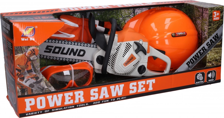 In de verpakking zit basisuitrusting – helm, handschoenen en veiligheidsbril – die goede veiligheidsgewoonten tijdens het spelen bevordert. Dankzij de compacte lengte van 35 cm ligt de zaag prettig in kinderhanden en is hij eenvoudig te bedienen.