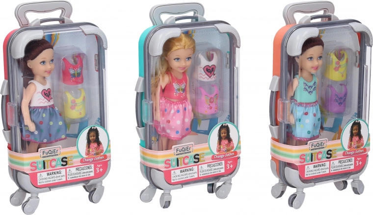 Een schattige pop in een praktisch koffertje maakt elk kind blij, thuis en onderweg. De set bevat een pop van 14 cm en twee reserve T-shirts voor eenvoudig verkleden. Het koffertje van 20 cm maakt opbergen en meenemen makkelijk en de pret wordt vergroot door 3 verschillende varianten qua uiterlijk.