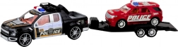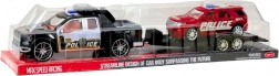 De zwarte politie pick-up trekt op de aanhanger een rode SUV met opvallende POLICE-opdruk. Details, zwaailichten en vrijloopwielen stimuleren fantasierijk spel.