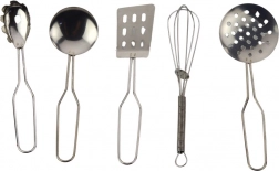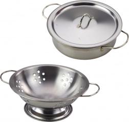 De set bevat een gevarieerde selectie pannen en accessoires: een pan met deksel, een diepe pan met handgrepen, een koekenpan, vergiet/zeef, garde, soeplepel, geperforeerde spatel, dichte spatel, schuimspaan, ovenwant en theedoek. De set stimuleert de verbeelding, ondersteunt rollenspel, en leert samenwerken en organiseren in de keuken.