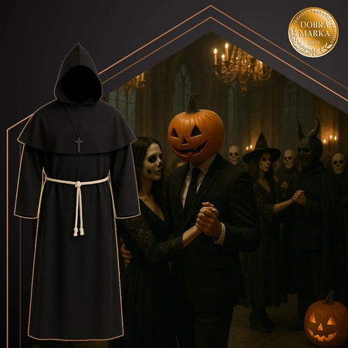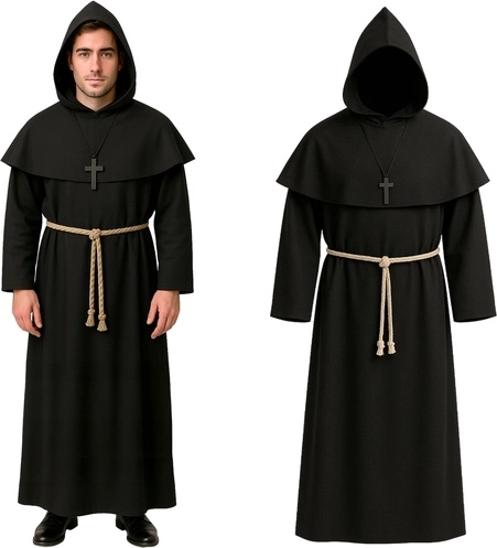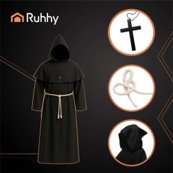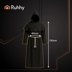 Stap in de mysterieuze sfeer van de middeleeuwen met het RUHHY monnikenkostuum. De lange donkere tuniek met wijde mouwen, de losse kap en het opvallende kruis zorgen voor een authentieke en indrukwekkende uitstraling die meteen opvalt. De ruime en comfortabele pasvorm biedt bewegingsvrijheid voor de hele avond.