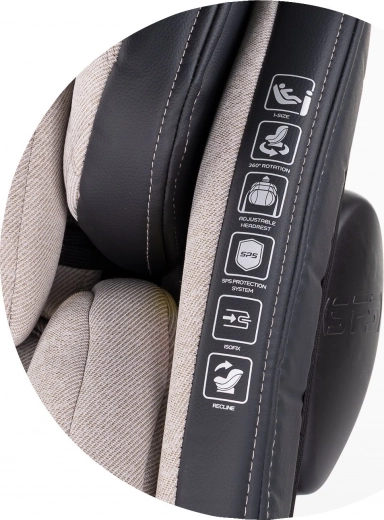 SPS zijbescherming, 5-puntsgordel, 11 posities van de hoofdsteun, 4 zit-/ligstanden en een 3D-kussentje voor drukverlichting zorgen voor veiligheid en comfort van baby tot schoolkind.