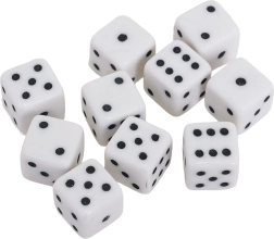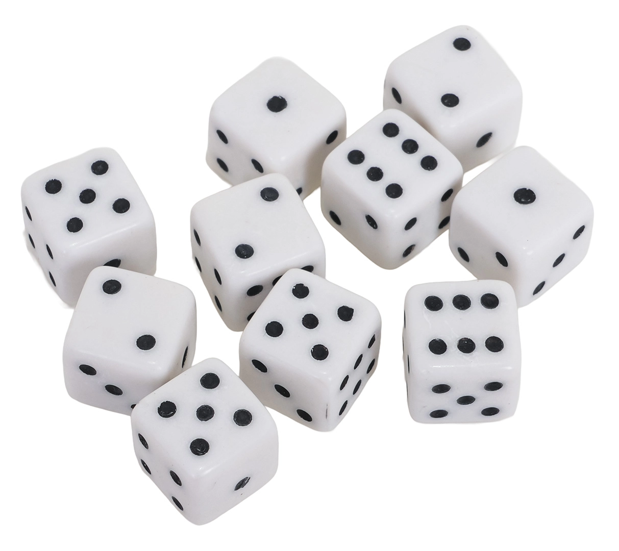 De set bevat 10 witte dobbelstenen met zwarte stippen voor duidelijke leesbaarheid en veelzijdig gebruik.