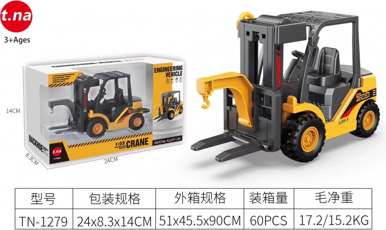 Realistisch model van een heftruck in schaal 1:55 dat kleine chauffeurs vanaf 3 jaar zal verrassen. Voorzien van frictieaandrijving, rubberen banden, een bewegende stuurhendel/stuur en de mogelijkheid om de lading handmatig te heffen en te laten zakken. Inclusief een pallet en metalen vorken met haak voor een nog authentiekere speelervaring.