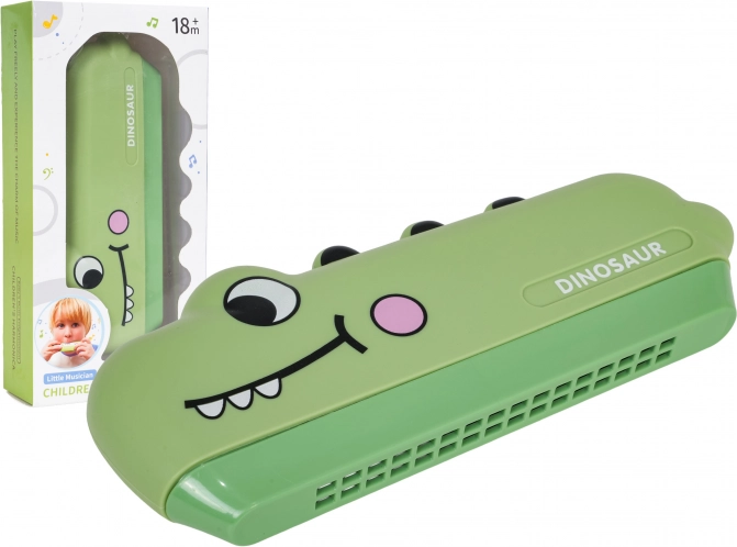 Schattige kinderharmonica in de vorm van een dinosaurus voor kleine muzikanten vanaf 18 maanden. Hij is licht en duurzaam, geeft een helder en zuiver geluid en dankzij het compacte formaat kan je kind hem makkelijk overal mee naartoe nemen. Stimuleert de ontwikkeling van gehoor en muzikale vaardigheden en verovert elk kind met het speelse dinosaurusdesign.