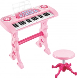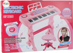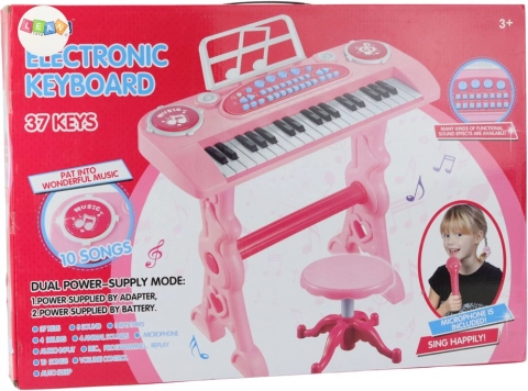 Praktisch is de dubbele voeding – het keyboard werkt op batterijen of met een adapter. De set bevat een krukje, zodat het kind comfortabel bij de toetsen kan en zich een echte artiest voelt.