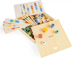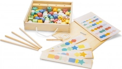 Ontdek een creatieve houten set om te sorteren en te rijgen die zowel de motoriek als de verbeeldingskracht van kinderen ontwikkelt. Spelenderwijs oefenen kinderen hun fijne motoriek, logisch denken en herkennen van kleuren en vormen dankzij 56 kralen, voorbeeldkaartjes en praktische sorteerstatieven – allemaal opgeborgen in een stevige houten doos met deksel.
