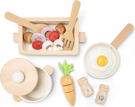 De set bevat een in drie stukken verdeelbare wortel met klittenband, een koekenpan, een pan met deksel, twee houten spatels, een zoutvaatje en pepervaatje en andere kleurrijke “ingrediënten”. De duurzame houten constructie en gladde oppervlakken garanderen een lange levensduur en een prettige aanraking.