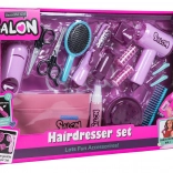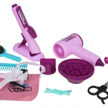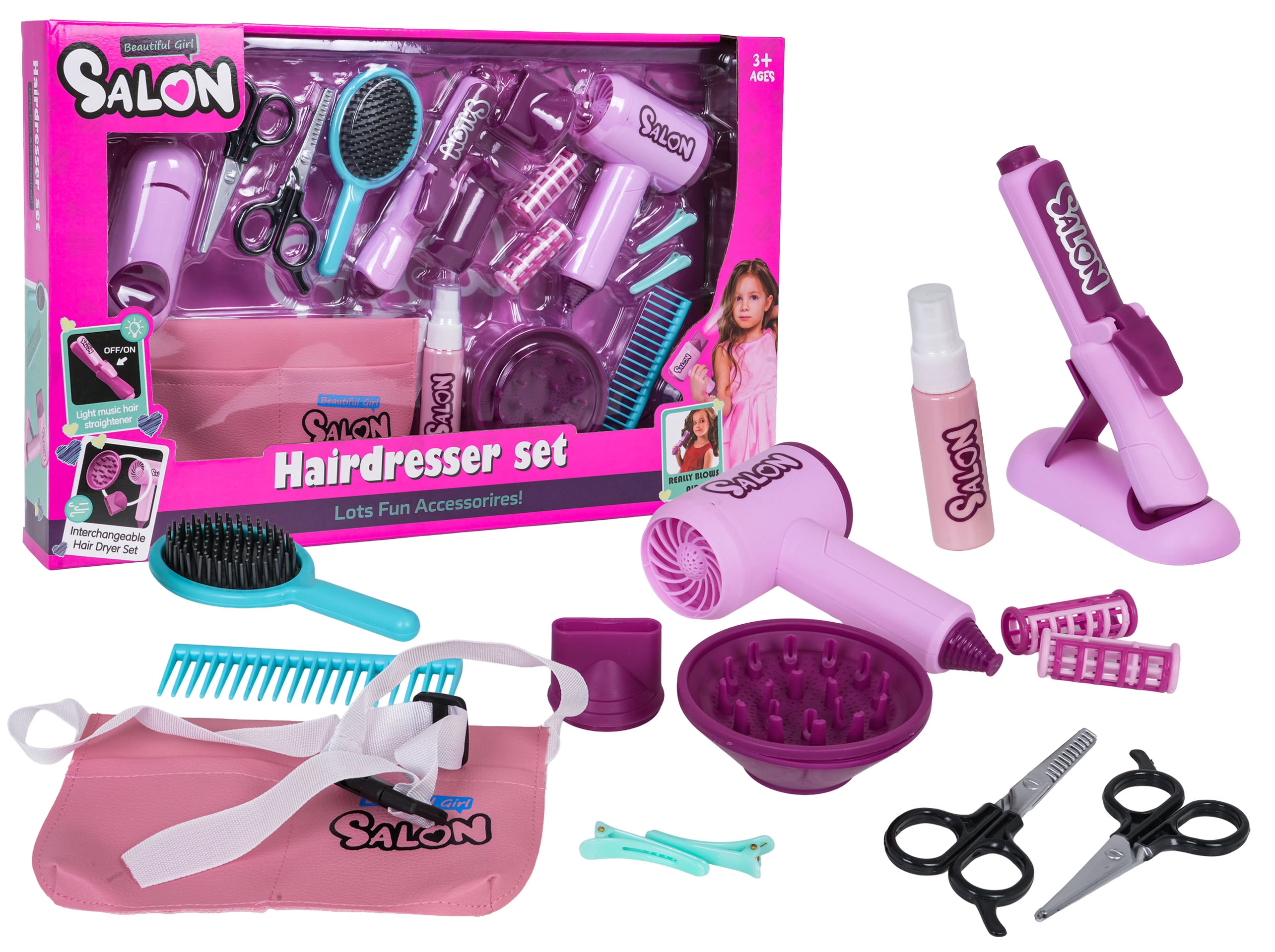 Onderdeel is een kinderlijke föhn met twee opzetstukken (diffuser en concentrator), die het geluid van föhnen produceert en een zachte luchtstroom geeft voor een authentieke ervaring. De kinderstijltang werkt op knoopcelbatterijen en heeft een lichteffect. De set wordt aangevuld met een kam, borstel, schaar, effileerschaar, speldjes, krulspelden en een flesje voor “cosmetica” – perfect voor creatief spel en de ontwikkeling van de fijne motoriek.