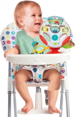 Door aan het stuur te draaien “stuurt” het autootje naar rechts en links en wordt inhoud geactiveerd die is geïnspireerd op echt rijden – ideaal voor de ontwikkeling van oog-handcoördinatie.