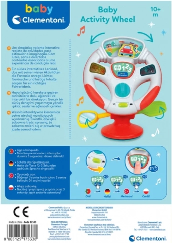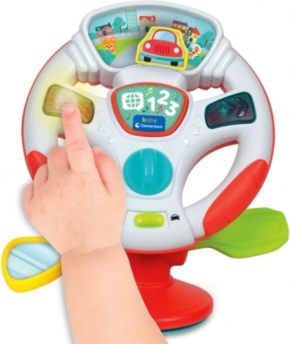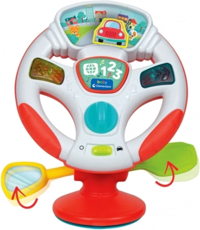Ontdek het plezier van je eerste “rit” met het interactieve stuur van CLEMENTONI. Wanneer je aan het stuur draait, beweegt het autootje op de kleurrijke weg naar rechts of links en activeert het inhoud die past bij echt rijden. LED-lichteffecten, realistische geluiden en vrolijke melodieën ondersteunen waarneming en concentratie.