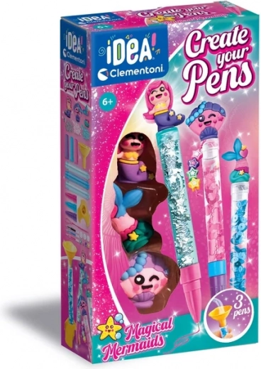 Maak je eigen glinsterende pennen met zeemeerminnen! Met deze creatieve set van CLEMENTONI IDEA kunnen kinderen tot 3 stijlvolle pennen ontwerpen met veel versieringen. Dankzij de standaard en de trechter is vullen eenvoudig en schoon, terwijl de drijvende decoraties in water voor een verbluffend effect zorgen. Een geweldig cadeau dat creativiteit en handigheid stimuleert.