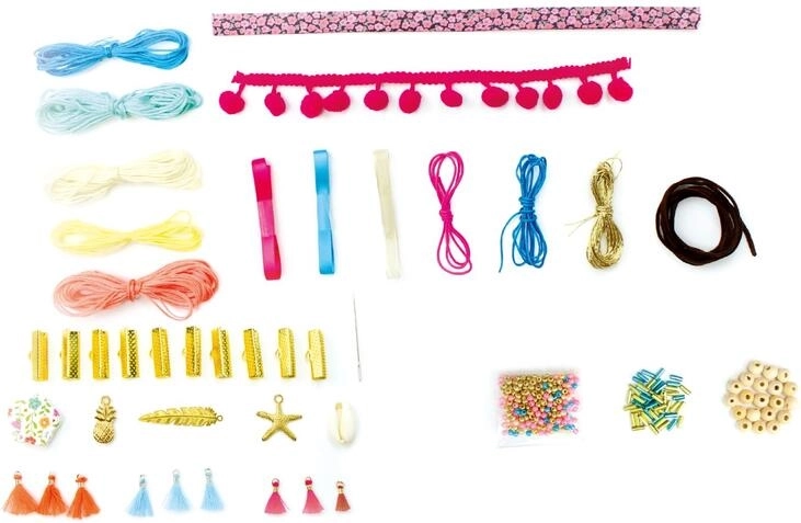 - 25 m katoenen draad, 1,5 m gewaxte draad, 100 kralen, 16 houten kralen, 30 kralen in een buisje, 25 cm leerdraad, 25 cm pomponlint, 3 stalen bedels, 1 schelp, 1 bedrukte kraal, 75 cm lint, 5 kettinkjes met sluiting, 10 grote sluitingen, 1 naald, 9 pompoms, 25 cm bedrukt lint, 5 armbanduithouders, 2 standaards voor armbanden