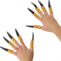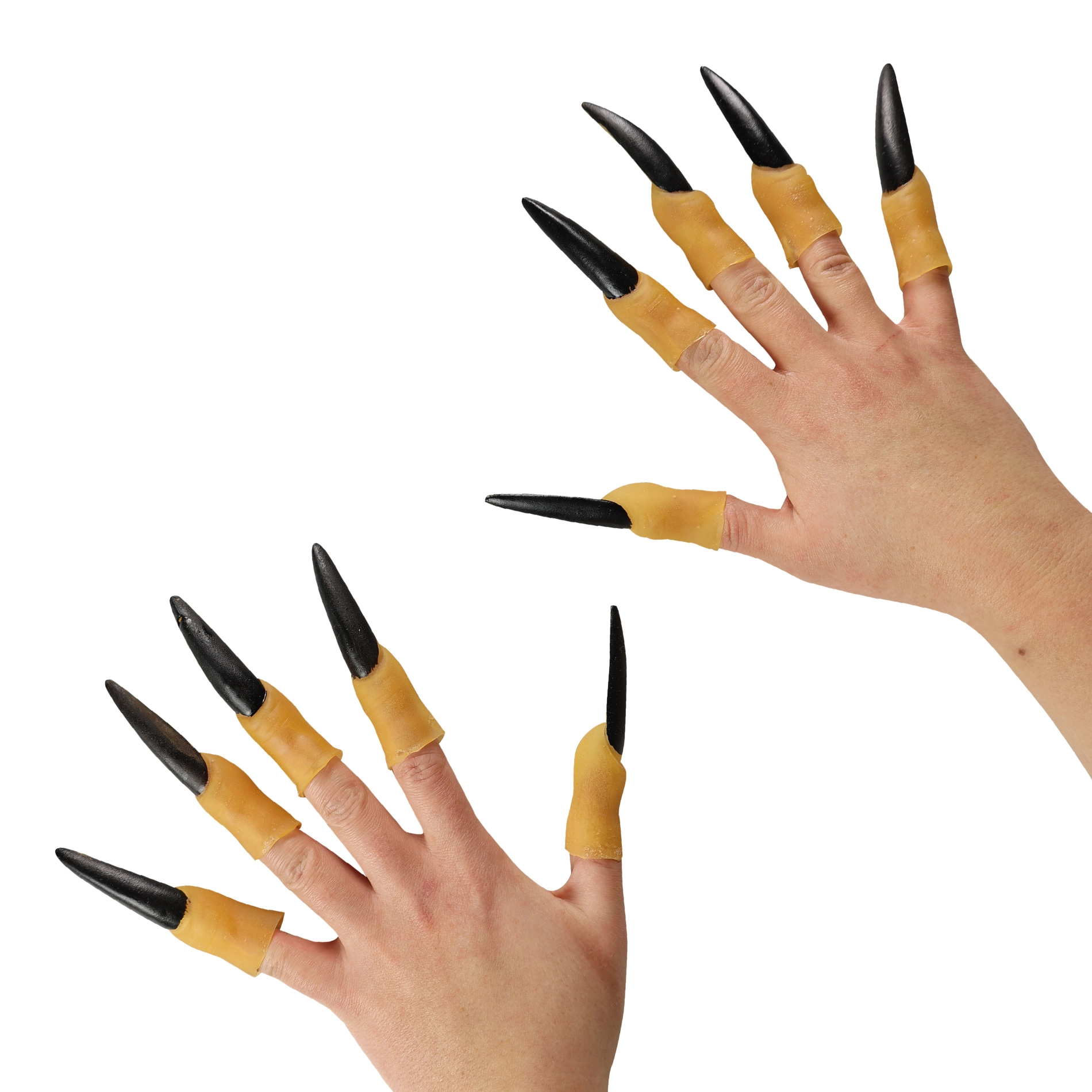 Creëer in een handomdraai een creepy effect! De rubberen heksenvingers met opvallende zwarte nagels zijn eenvoudig aan te schuiven en veranderen je handen meteen in een spookachtig accessoire voor elk kostuum. Geweldig voor Halloween, verkleedpartijen en themafeesten.