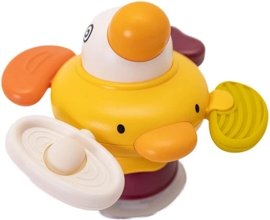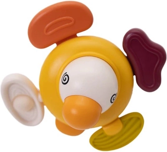 Dankzij de zuignap bevestig je de eend eenvoudig op gladde oppervlakken – bijvoorbeeld op de kinderstoel, een tafel of het autoraam. Het siliconen bijtspeeltje verzacht het doorkomen van tandjes en de draai- en schuifelementen ontwikkelen de oog-handcoördinatie.