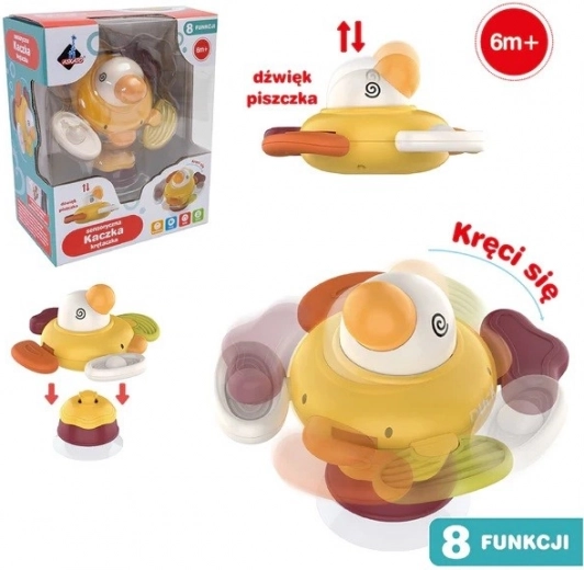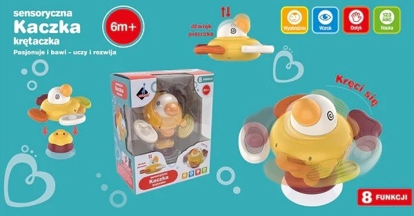 De leuke interactieve sensorische eend ondersteunt bij baby’s de ontwikkeling van fijne en grove motoriek, zicht, tast en gehoor. Dankzij de zuignap bevestig je hem eenvoudig op gladde oppervlakken, zodat je kindje veilig op de buik kan spelen en nekstabiliteit en nekspierkracht kan trainen.