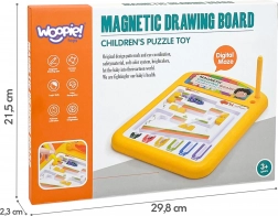 Het magnetische WOOPIE-bord is een leuk en educatief hulpmiddel dat zelfstandig ontdekken en concentratie stimuleert. Met de magnetische stylus trekt het kind de verborgen metalen bolletjes naar het oppervlak en vormt er figuren en patronen mee. De bolletjes zijn veilig binnenin het bord afgesloten, waardoor er geen rommel ontstaat en er geen onderdelen kwijtraken.