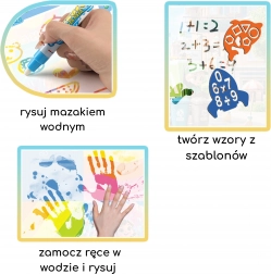 De set bevat waterstiften, foamstempels en een boekje met ideeën die inspireren tot nieuwe afbeeldingen en patronen. Dankzij het royale formaat is de mat ideaal voor samen tekenen met broers en zussen of ouders en kinderen.
