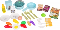 Pan, koekenpan, keukengerei, bordjes en voedselrekwisieten vullen de oven en de “ice box” aan. Haken en plankjes helpen de boel netjes te houden tijdens het spelen.