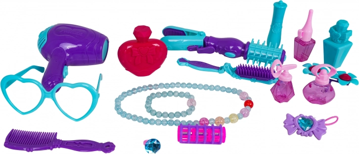 Bevat een föhn, krultang met stijltang, opvouwbare borstel, kam, bril, flesjes, “lippenstift” en “lak”, kralen, armband, ring, speldjes, elastiekje en andere kleinigheden.