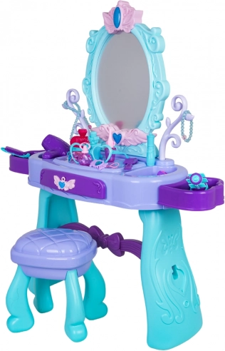 Geef kinderen hun eigen magische beautyhoek. Deze kaptafel in turquoise en paars biedt een grote ovale spiegel met verlichting, een praktische lade en zij-aflegvlakken voor alle accessoires. Het stabiele krukje zorgt voor comfortabel zitten en veilig spel.