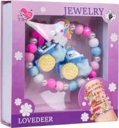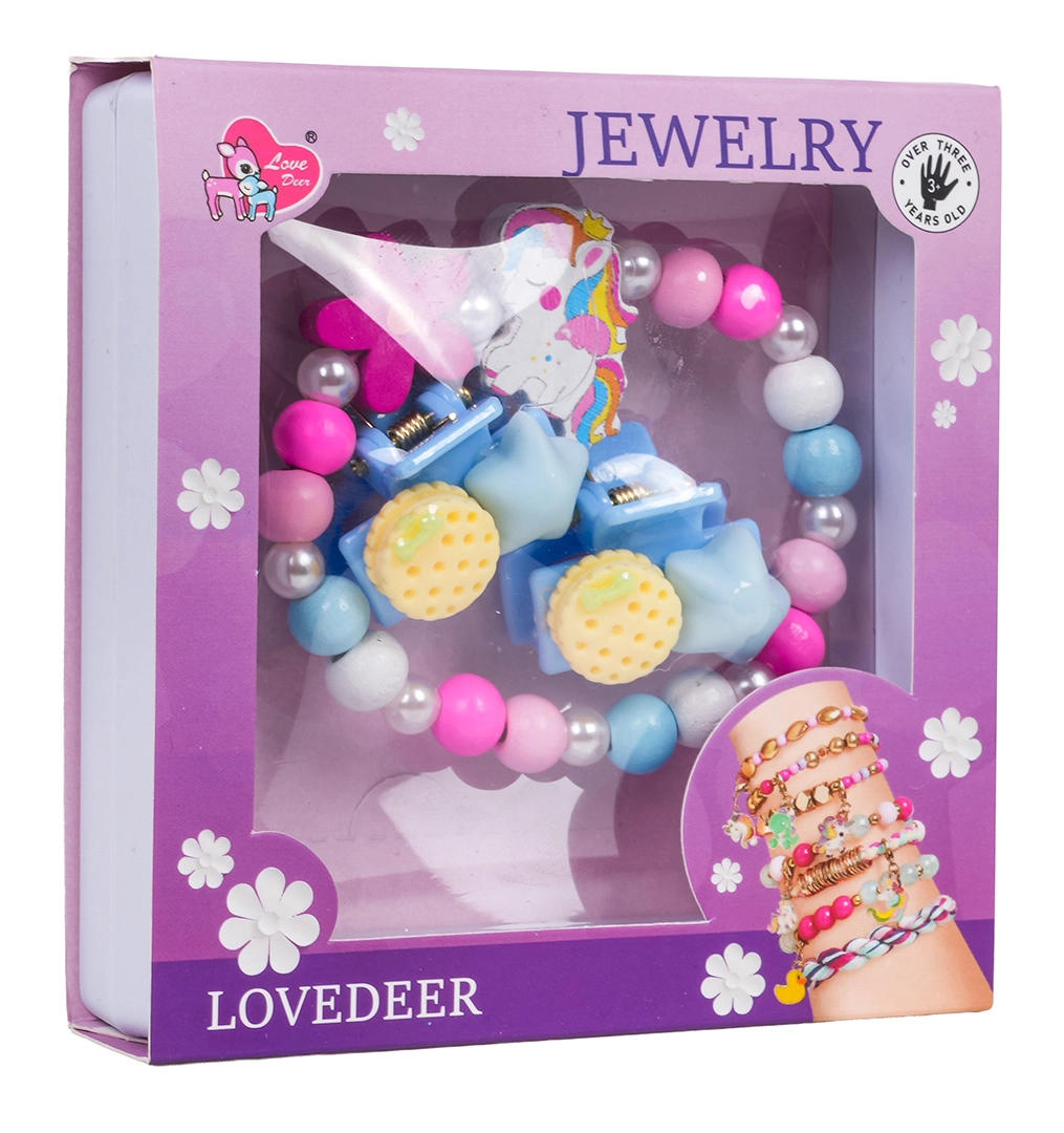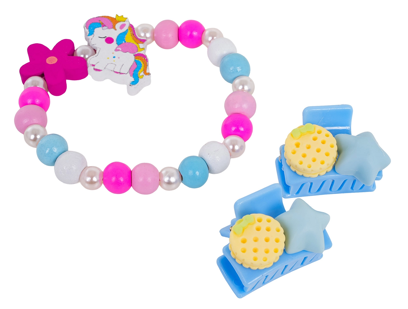 Een schattige kindersieradenset met eenhoornthema die elke kleine fashionista vanaf 3 jaar zal verrassen. Bevat een elastische armband van kleurrijke kralen en twee haarspeldjes. De set is gemaakt met oog voor detail, in levendige kleuren en is ideaal als cadeau.