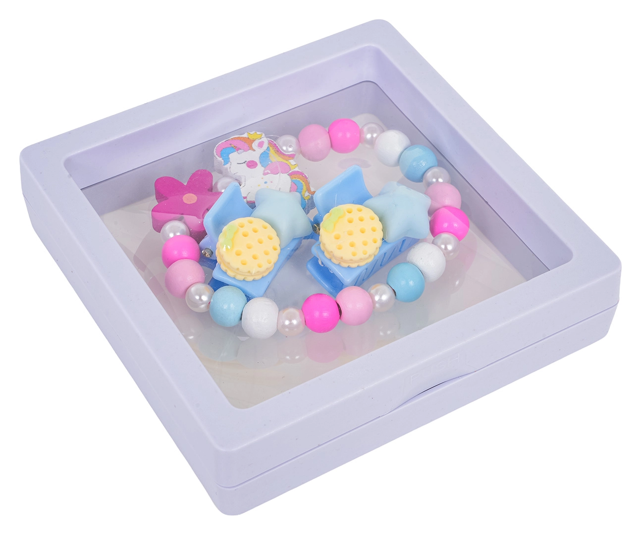 Ontdek de speelse sieradenset met een eenhoorn, die kleurrijke kralen, pareltjes en bijpassende haaraccessoires combineert. De elastische armband is makkelijk om te doen, de speldjes houden fijne lokjes goed vast en de hele set is perfect voor dagelijks pronken en feestelijke momenten.