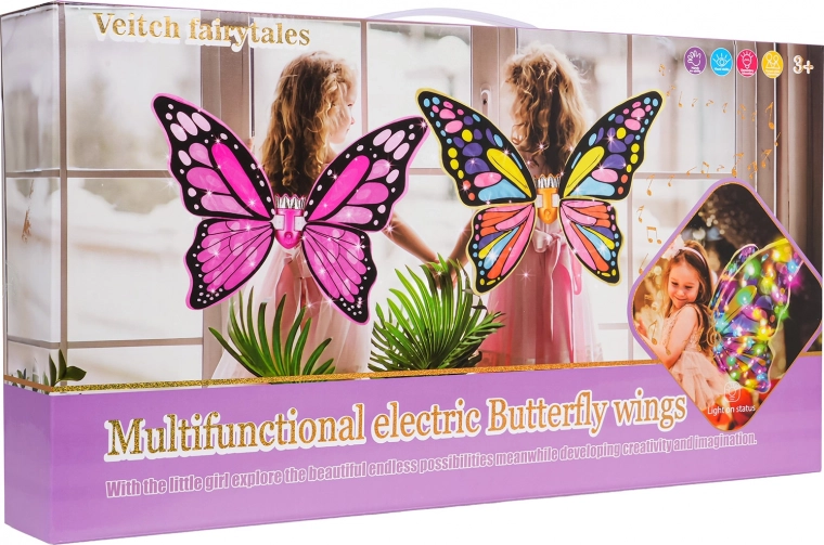 Grote roze vleugels met meerdere licht- en fladderstanden geven elk spel een magische sfeer. De bediening is eenvoudig, het effect is betoverend en veilig voor kinderen.