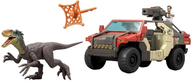 Beleef filmwaardige avonturen met de Jurassic World-set: een terreinwagen met schietfunctie, een afneembare toren met werper en twee figuren – een velociraptor en bestuurder Martin Krebs. De wagen (27 cm) vuurt pijlen voor DNA-afname of een vangnet af voor spannende achtervolgingen en gevechten. De velociraptor kan gescand worden in de Jurassic World Play-app en ontgrendelt digitale gameplay. Ideaal cadeau voor kinderen vanaf 4 jaar.
