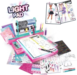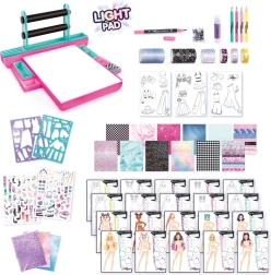 Ontwerpstudio met verlichte lichttafel, 20 modellen, 1 dubbelzijdige marker, zakje met 25 steentjes, lijm, 4 kleurpotloden, 6 bedrukte rolletjes, 12 bedrukte vellen, 3 zelfklevende stofvellen, 2 sjabloonvellen, 3 vellen contour-sjablonen, 2 stickervellen