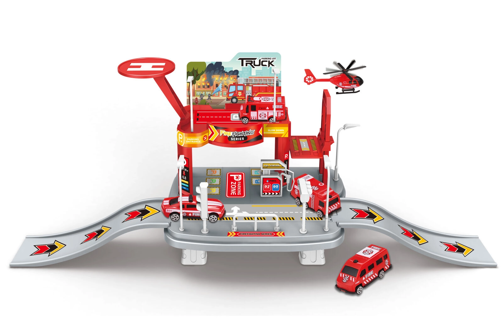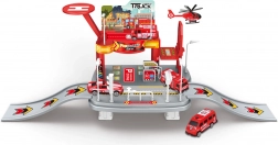 Deze gedetailleerd uitgewerkte brandweerkazerne biedt kinderen realistisch reddingsspel. Onderdeel is een complete parkeersectie met helihaven, een handmatige lift voor het verplaatsen van voertuigen tussen verdiepingen en een tankstation om brandstof bij te vullen. Met de meegeleverde borden creëren kinderen eenvoudig hun eigen verkeerssituaties.