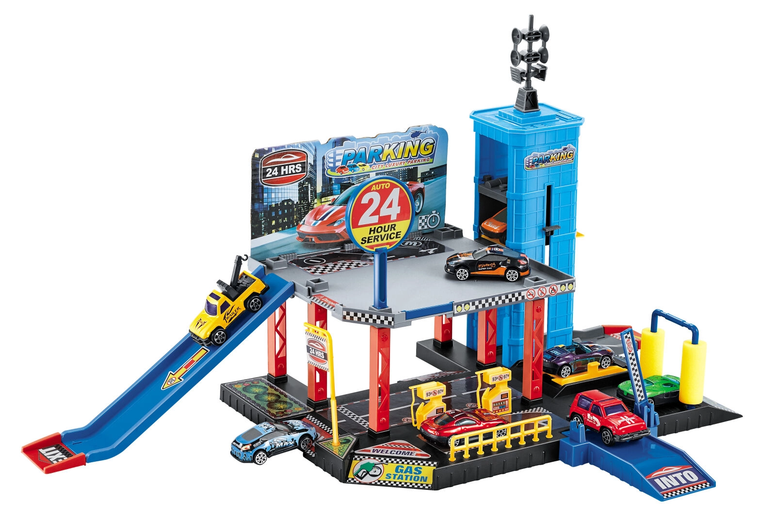 - Compleet speelset voor direct speelplezier – garage, lift, tankstation en 3 autootjes