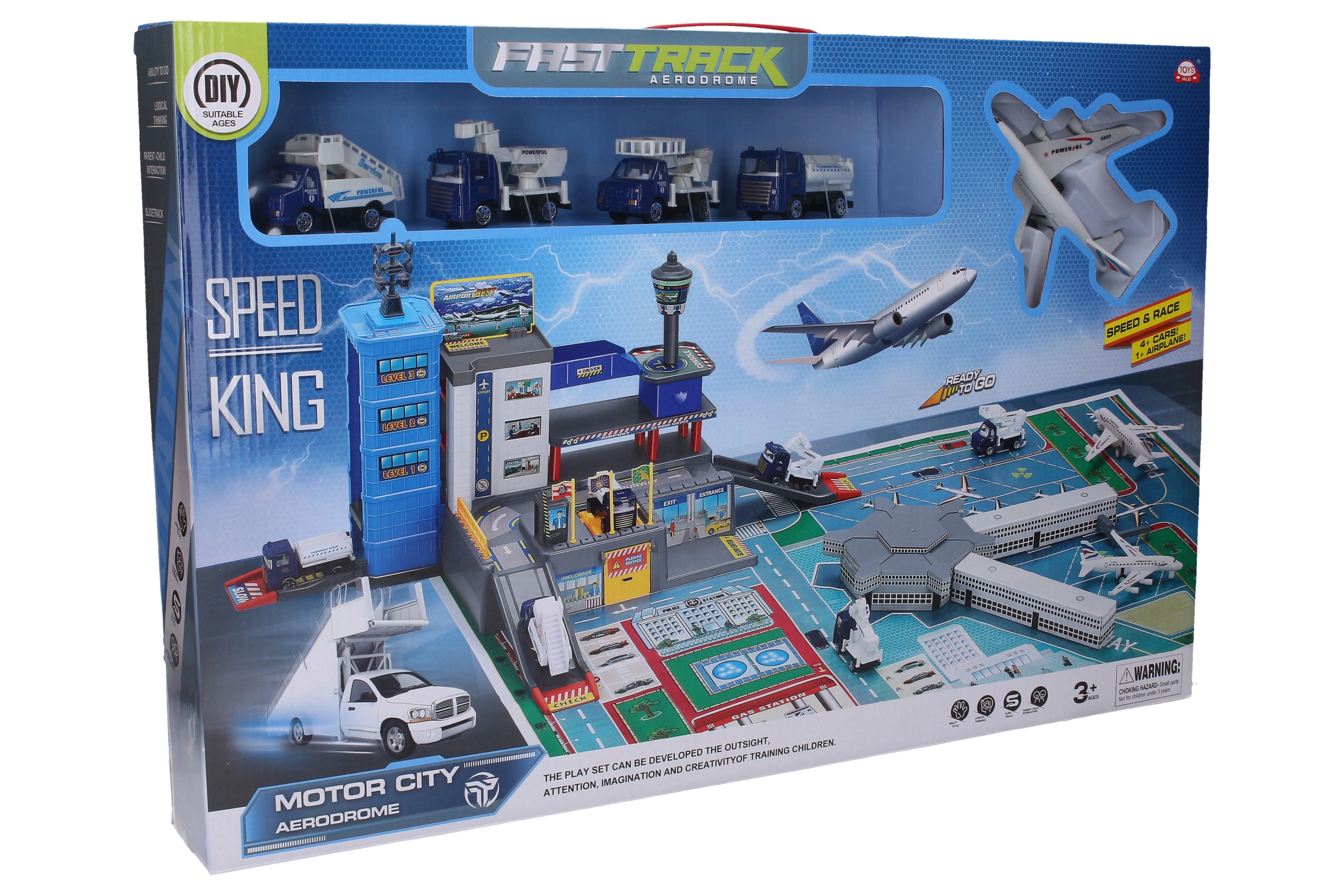 - Complete set – luchthaven-garage/speelgebied, 4 metalen autootjes, 1 metalen vliegtuig