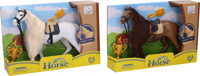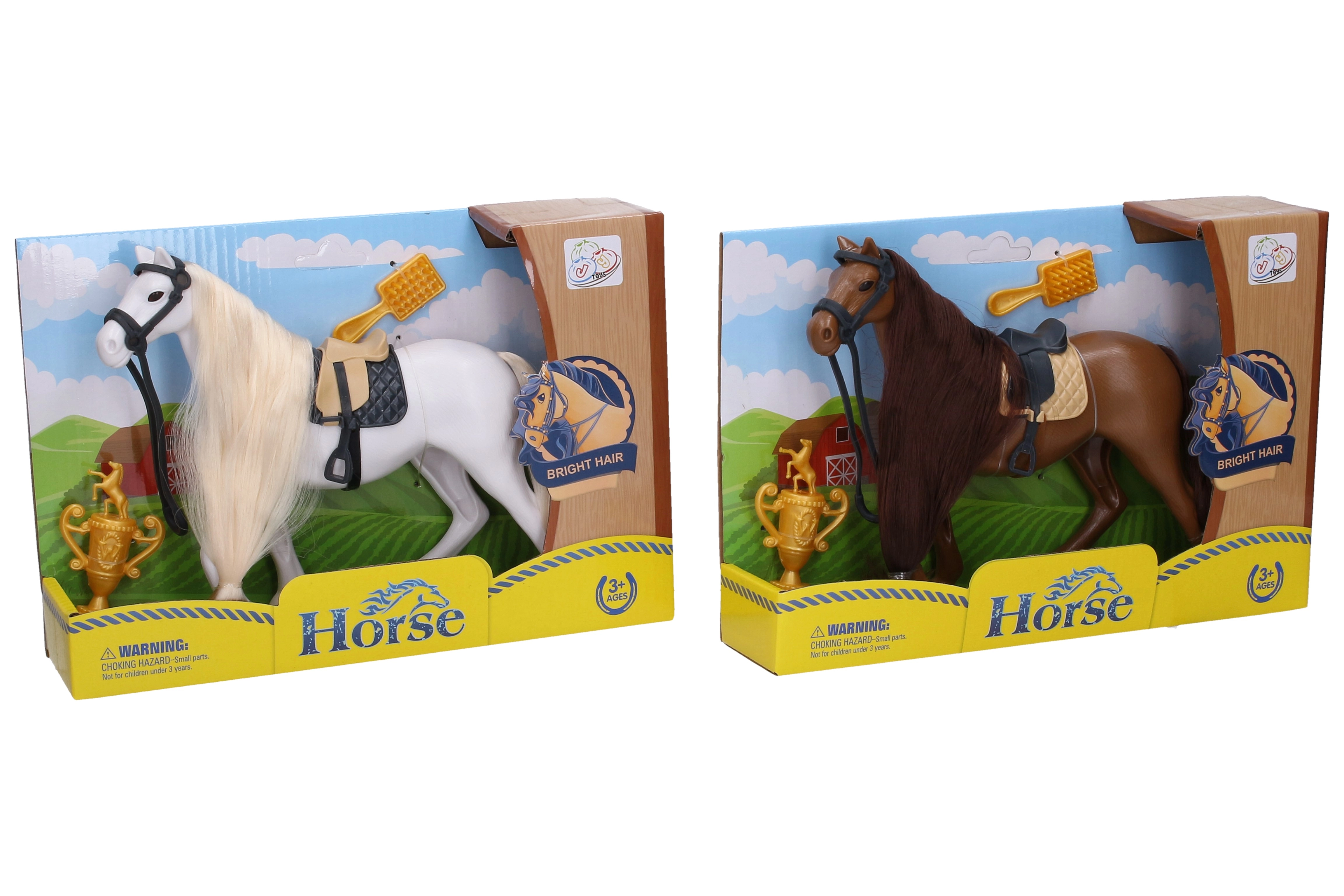Een realistisch paard van 19 cm in twee kleuren (bruin en wit) zal elke kleine paardenliefhebber plezier doen. De set bevat een paard met zadel en hoofdstel, een trofee en een borstel voor de manenverzorging – ideaal om een manege na te spelen en de fantasie te stimuleren.