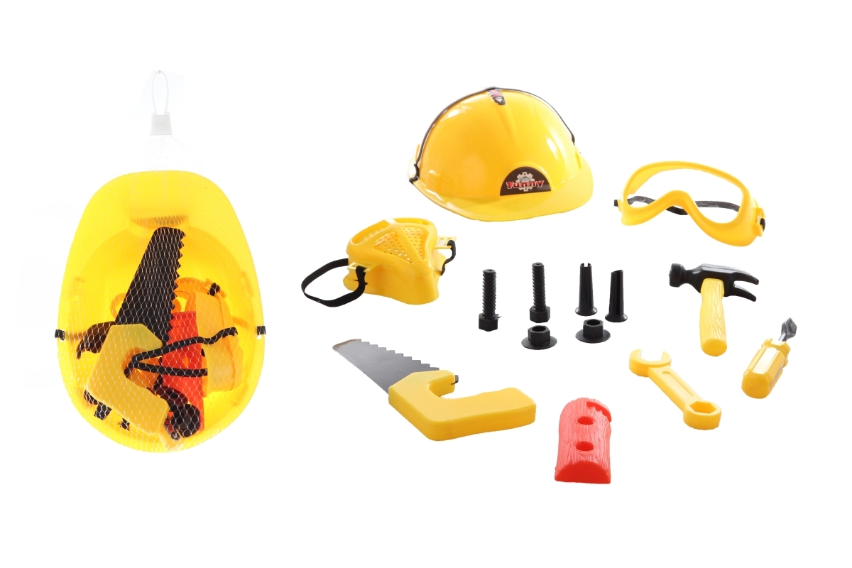 - Complete uitrusting: helm, bril, masker, zaagje, hamertje, schroevendraaier, sleutel, schroefjes en imitatiehout.