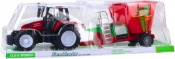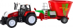 De rode trekker met aanhanger en grote voermengwagen bootst een echte landbouwmachine natuurgetrouw na. Dankzij het duwmechanisme rijdt het voertuig uit zichzelf verder en de aangekoppelde aanhanger met mengwagen voegt extra realisme toe – kinderen kunnen het voeren van dieren en het dagelijks leven op de boerderij simuleren.