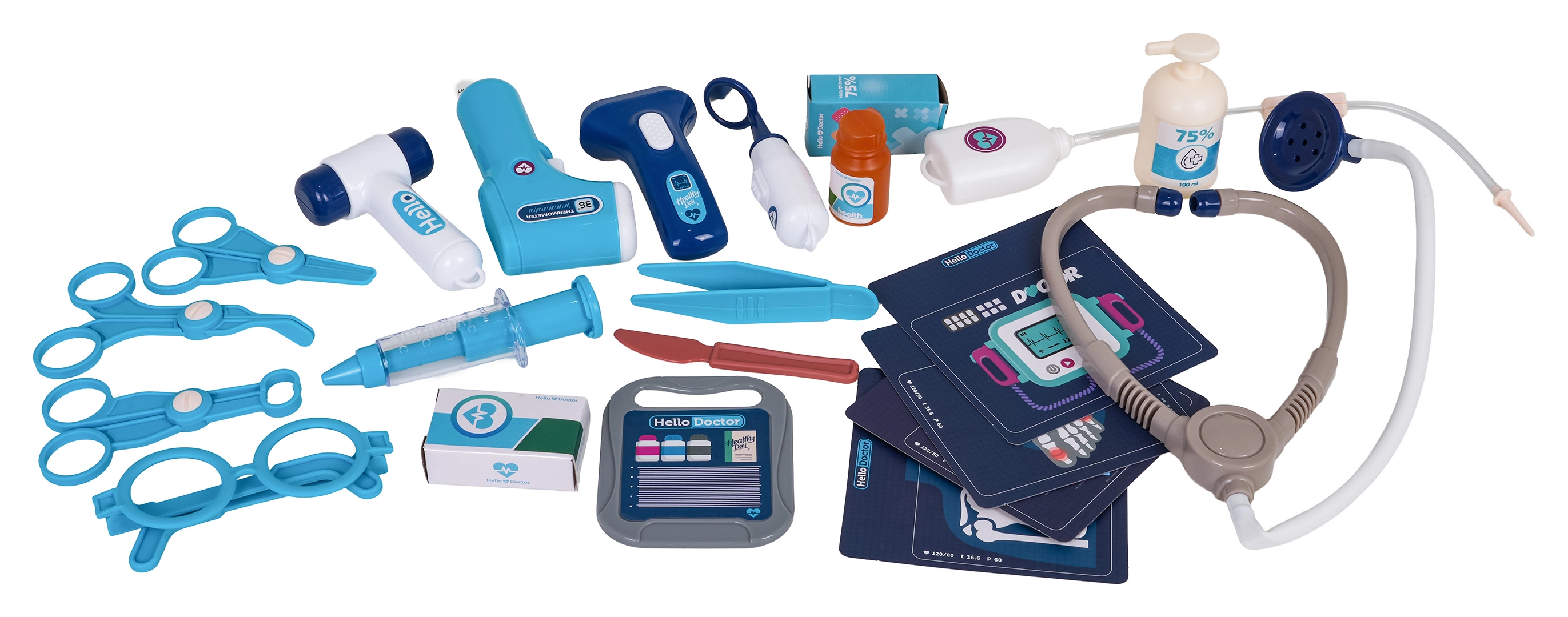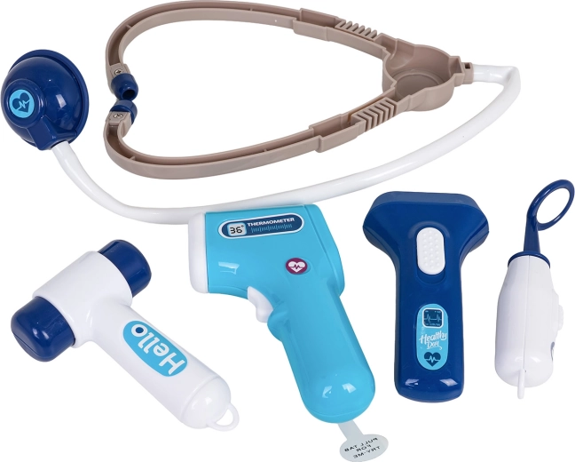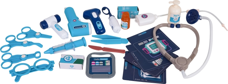 Stethoscoop, contactloze thermometer met licht, spuit, schaar, pincet, spiegeltje, hamertje, bril, patiëntkaart en meer accessoires voor creatief spel.