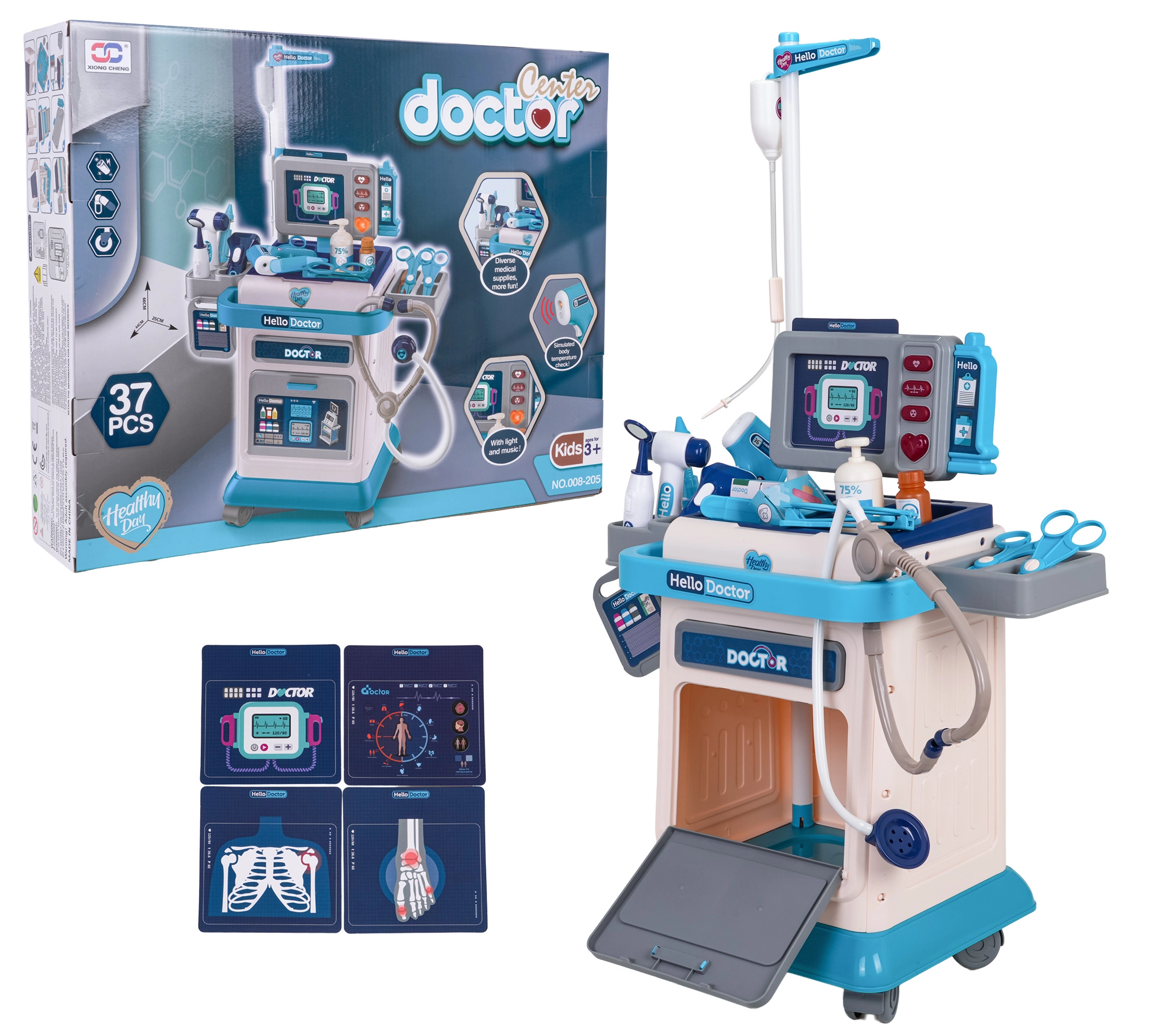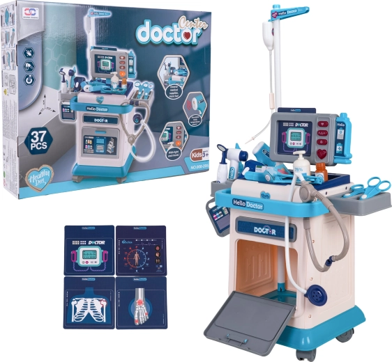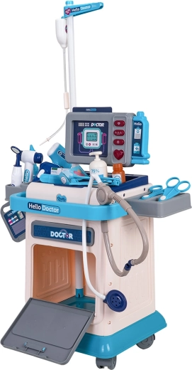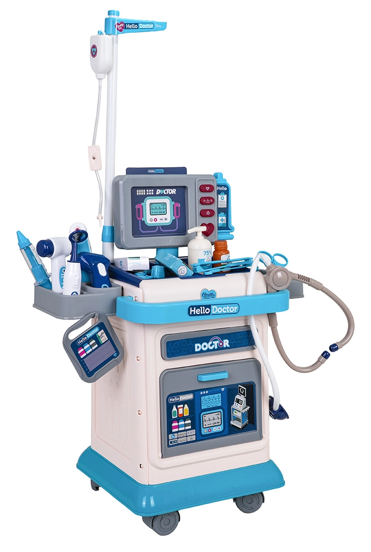 Deze rijk uitgeruste doktorset voor kinderen biedt leuk en leerzaam doktertje spelen. De stabiele kar op wieltjes met verstelbare duwbeugel maakt het verplaatsen van de hele praktijk eenvoudig, terwijl het monitorpaneel licht- en geluidseffecten biedt – hartslag, temperatuurmeting, CT-geluid en alarm. Inclusief verwisselbare afbeeldingen voor EKG en CT, die het spel nog realistischer maken.