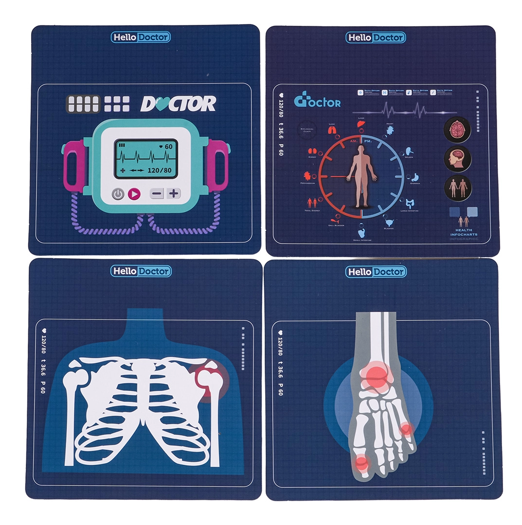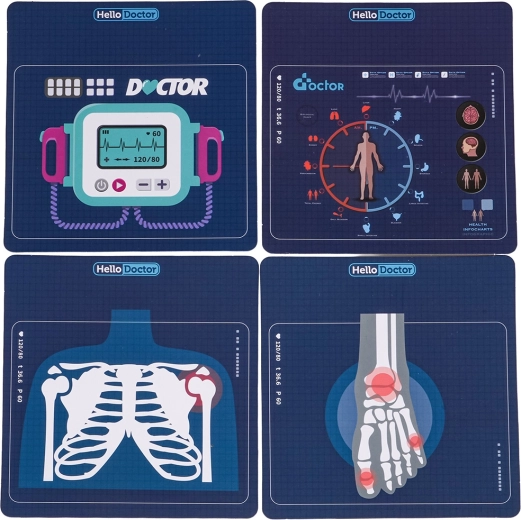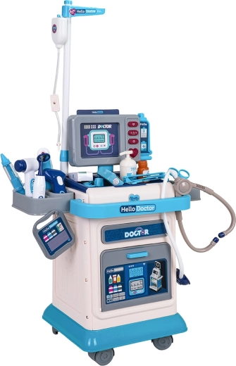Kinderen vinden in de set alles wat ze nodig hebben: stethoscoop, contactloze thermometer met licht, spuit, schaar, pincet, spiegeltje, neurologisch hamertje, bril en kleine extra’s zoals een patiëntkaart, flesje met “desinfectie”, doosje met pleisters en medicijnen of een infuusstandaard. De kar heeft een praktische lade en houders voor overzichtelijke opslag van de instrumenten.