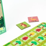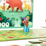 Inhoud van de doos: groot bos-speelbord (4 delen), 4 kartonnen totemfiguren van dieren, 4 karakterkaarten, 30 fiches, 12 voedselfiches, katoenen zak om te trekken.